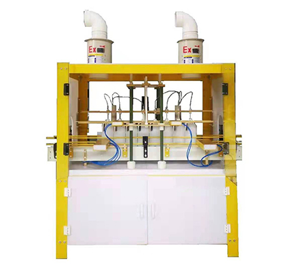 1.本机所有部件均采用PP材料和玻璃钢材料制作,封闭式外观设计,符合防腐标准,每次灌装时,灌装头伸入瓶中进行灌装,确保液体不起泡及溢出。